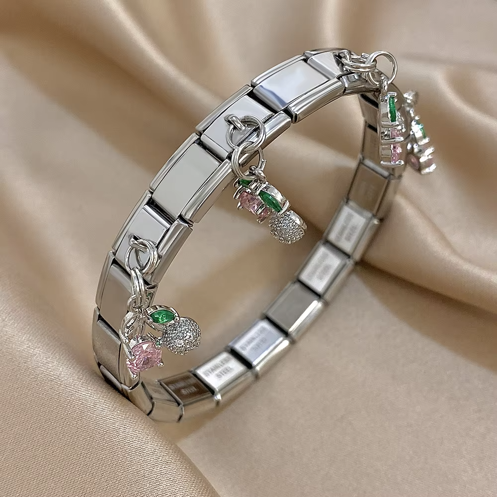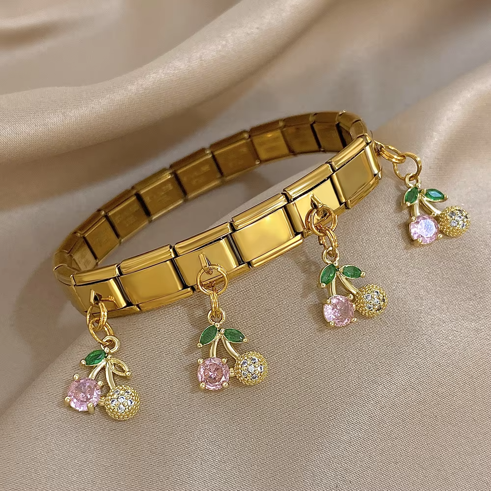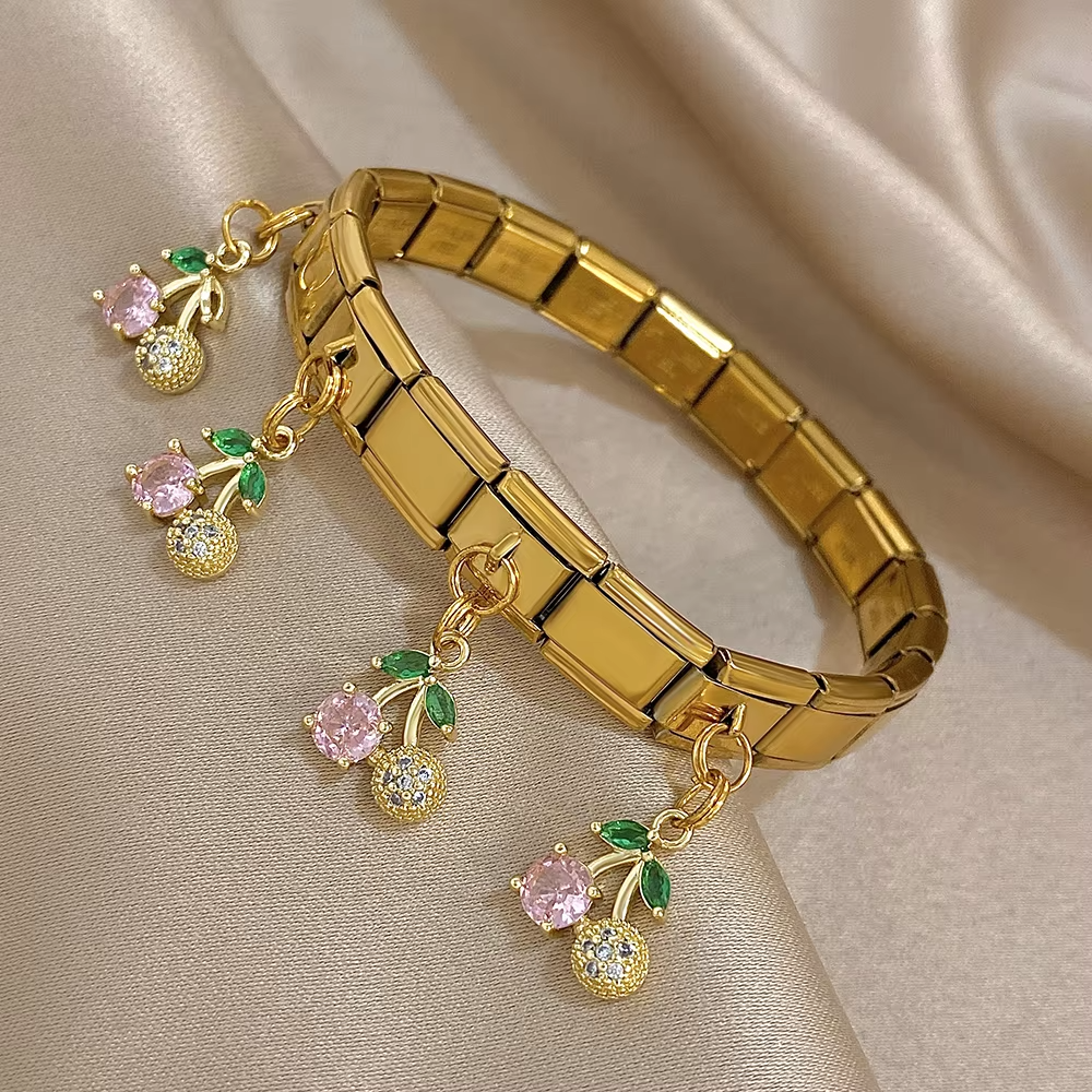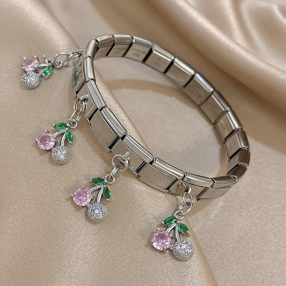 Luxury Stainless Steel Cuff Bracelets Bangles For Women Men Fashion Inlay Zircon Cherry Pendant Elastic Adjustable Waterproof